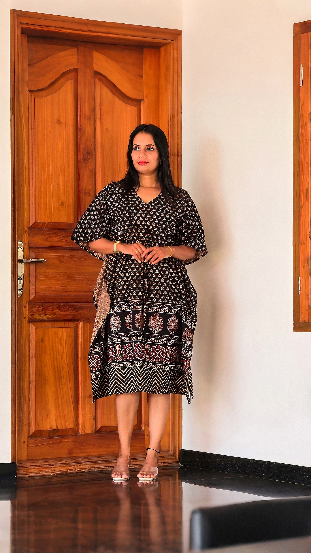 The Aira Ajrakh Cotton Kaftan is designed for effortless everyday comfort with a touch of traditional artistry. Crafted from soft, breathable cotton, this kaftan features natural Ajrakh hand block prints on a clean, minimal base—making it both elegant and easy to wear.