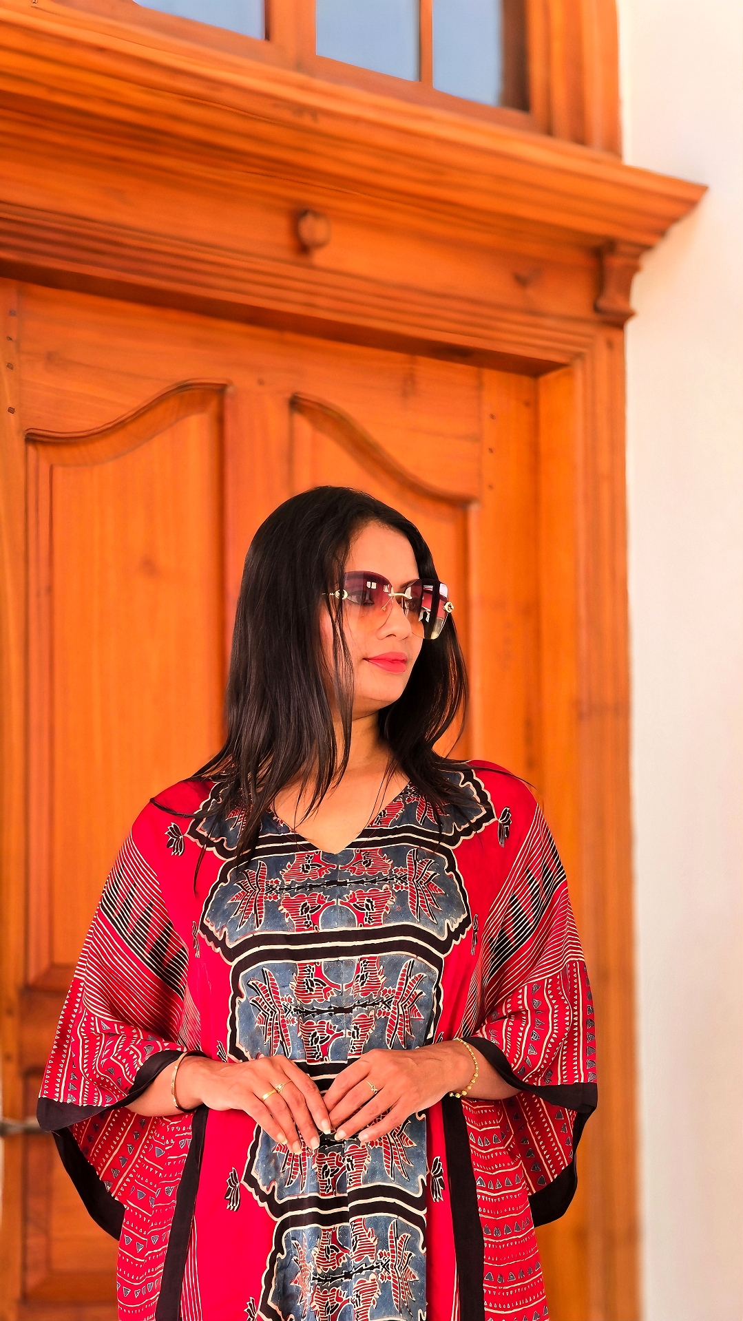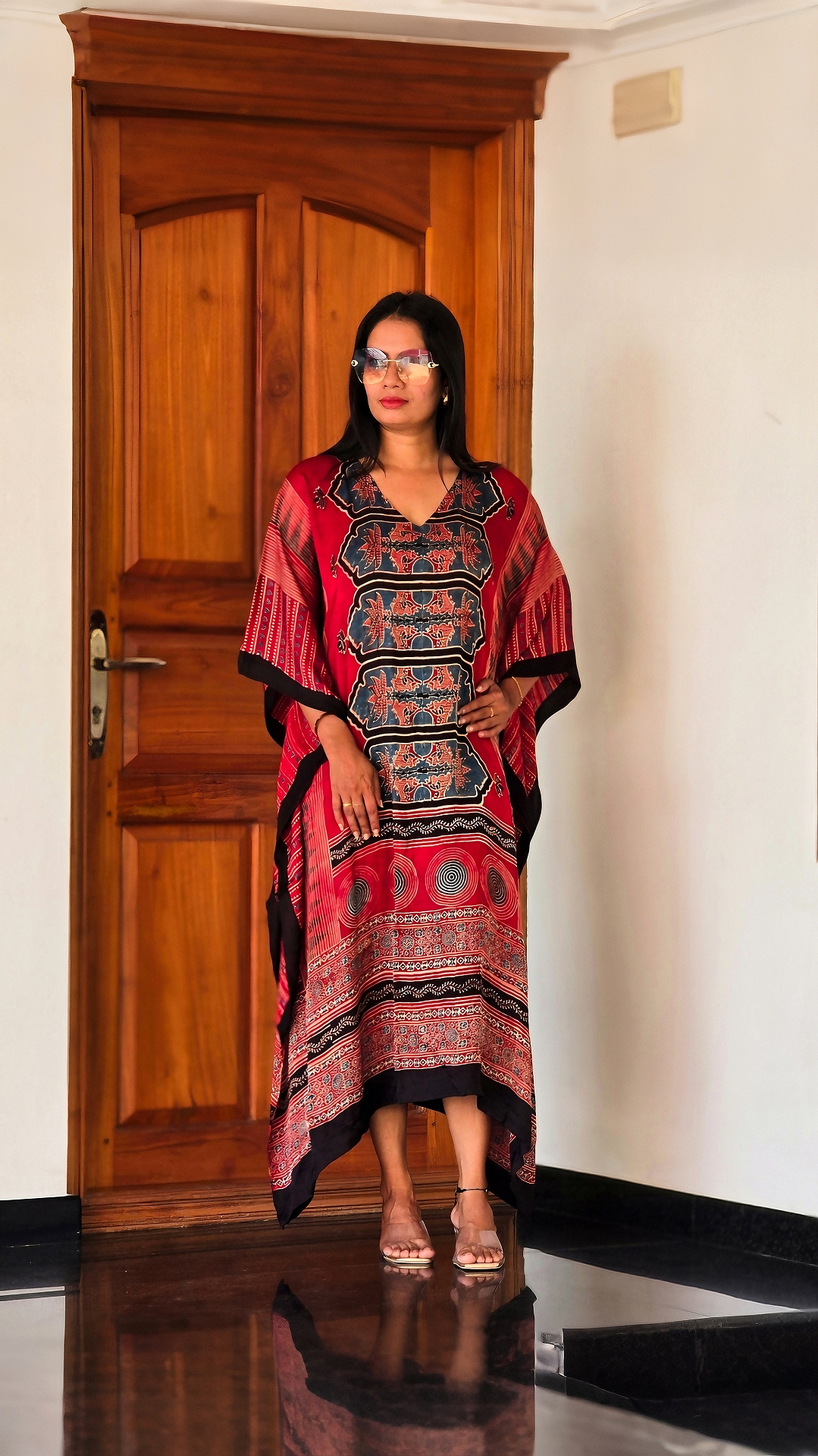 The Noor Ajrakh Modal Kaftan is a celebration of traditional Indian hand block artistry combined with modern comfort. Crafted from pure modal silk, this kaftan features authentic Ajrakh hand block prints, offering a rich yet timeless appeal across multiple colourways.