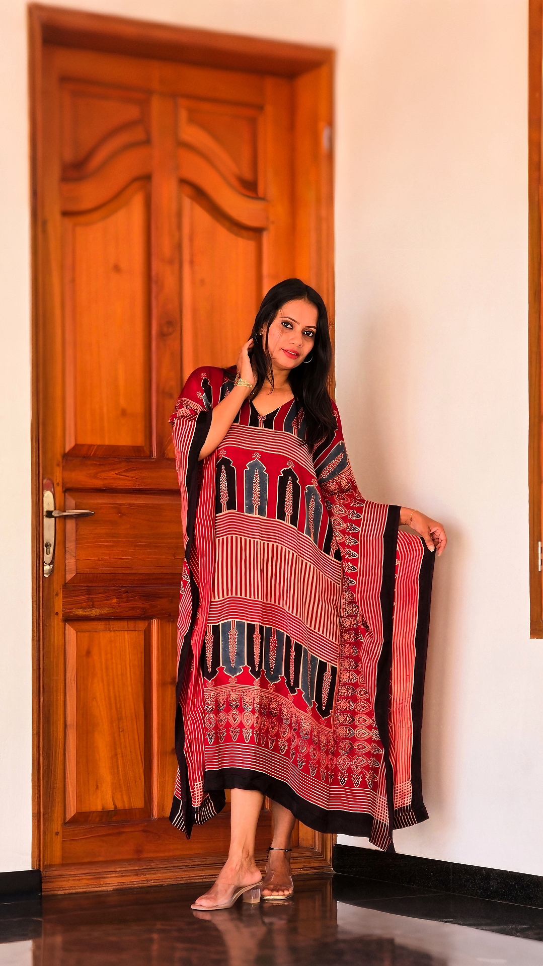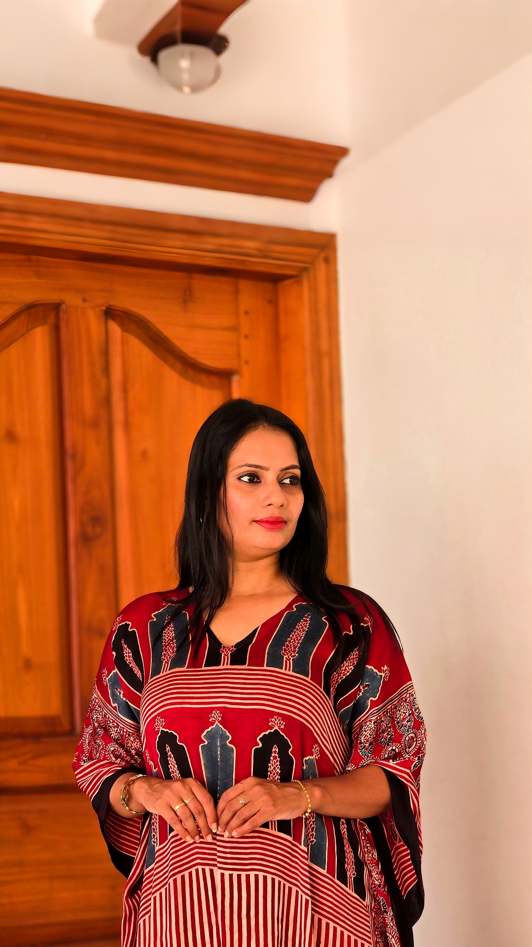 The Noor Ajrakh Modal Kaftan is a celebration of traditional Indian hand block artistry combined with modern comfort. Crafted from pure modal silk, this kaftan features authentic Ajrakh hand block prints, offering a rich yet timeless appeal across multiple colourways.