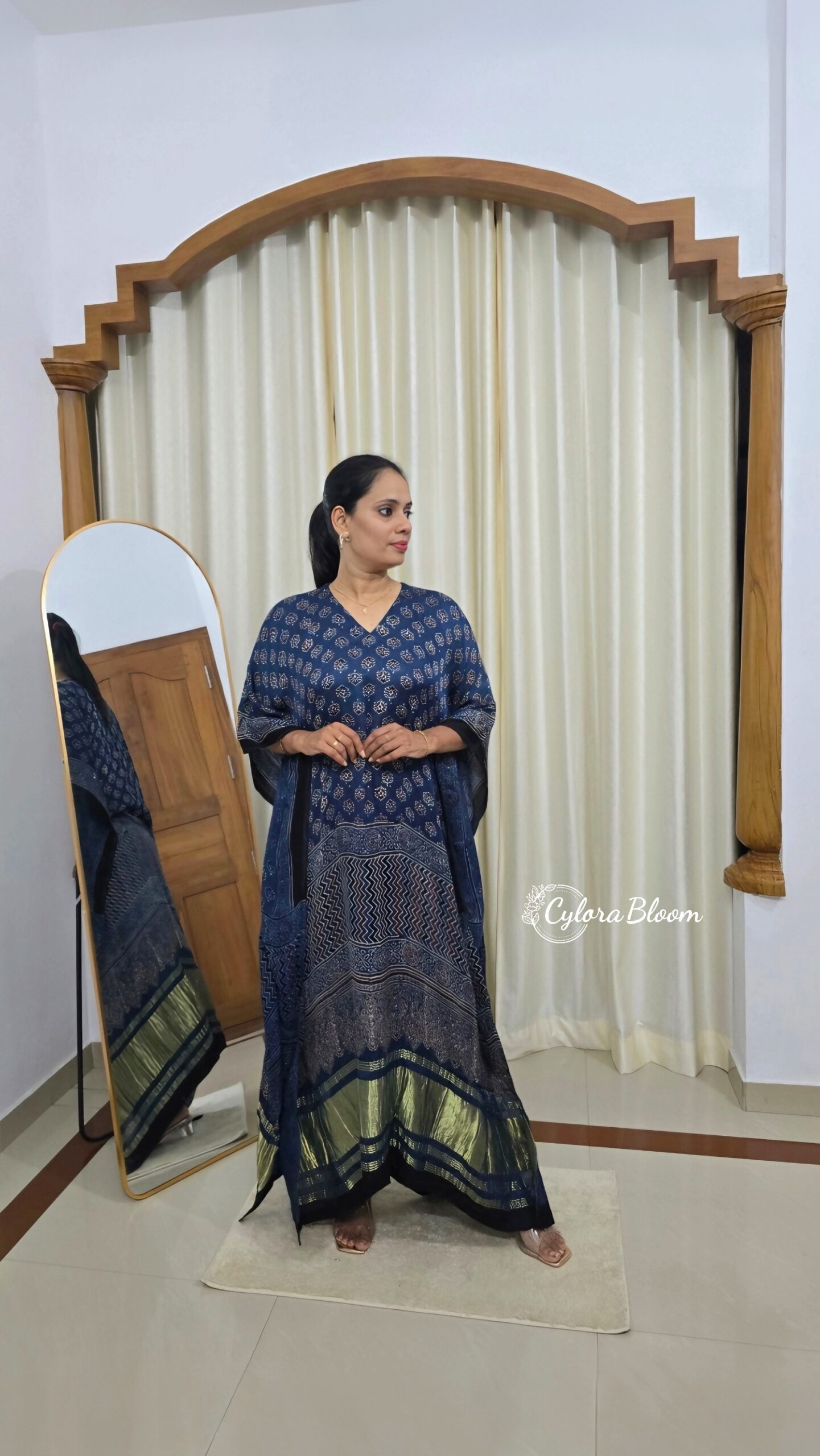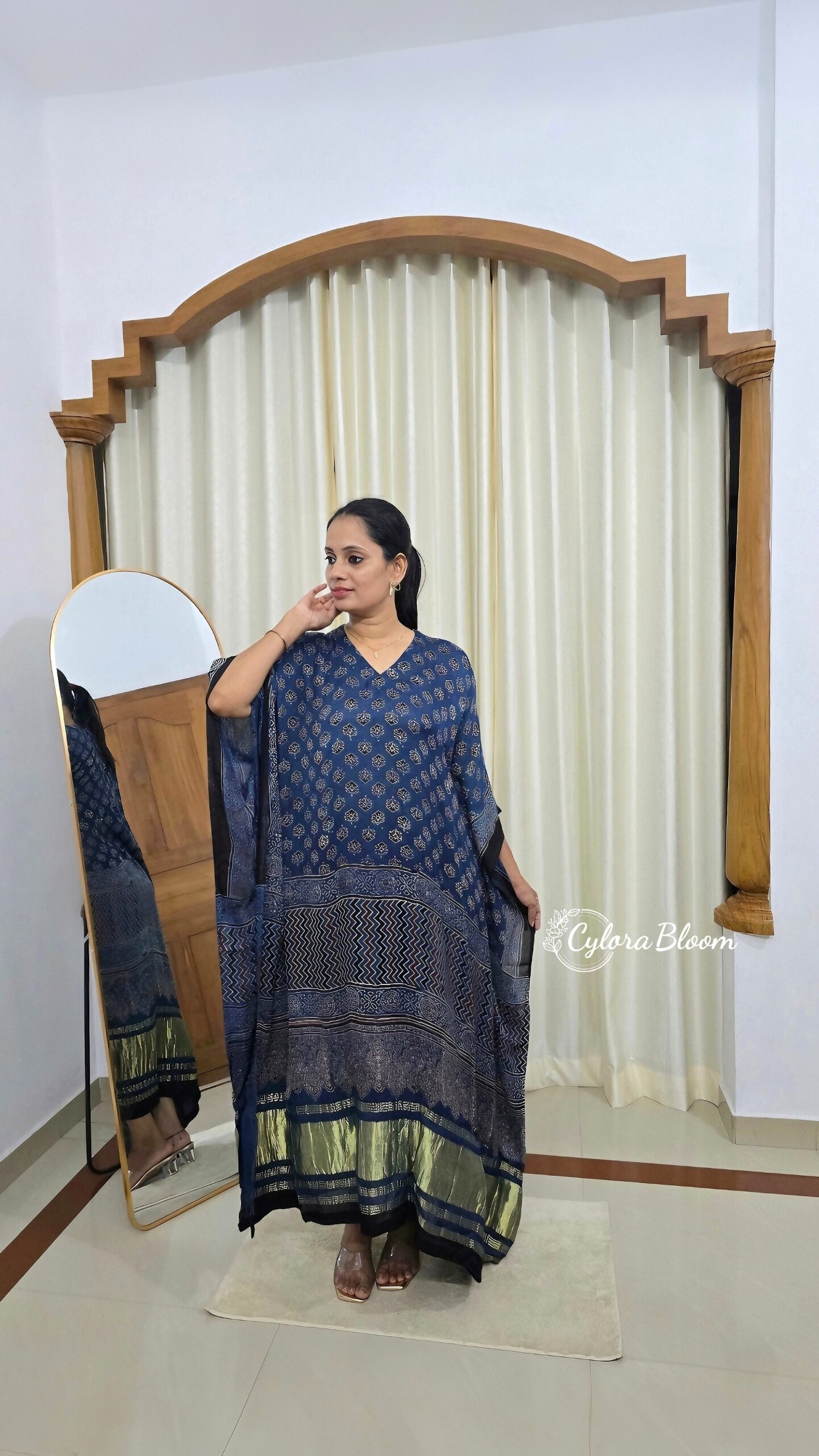 Zarika Ajrakh Modal Kaftan is a celebration of heritage prints and effortless elegance. Crafted in pure modal silk, this kaftan features a rich Ajrakh-inspired hand block print, beautifully finished with a zari daman that adds a subtle festive glow.