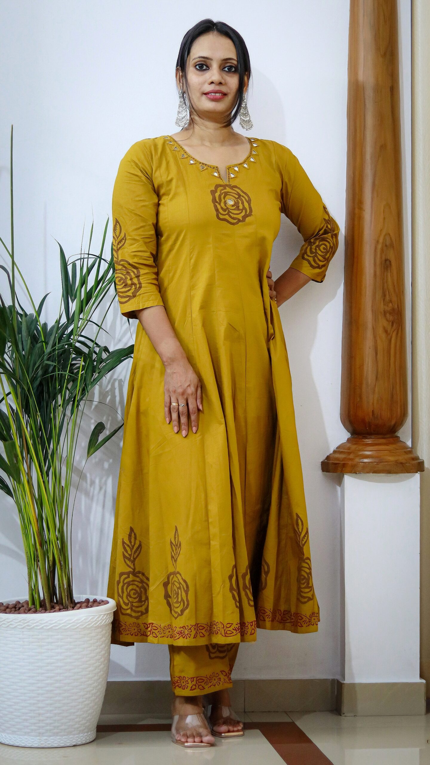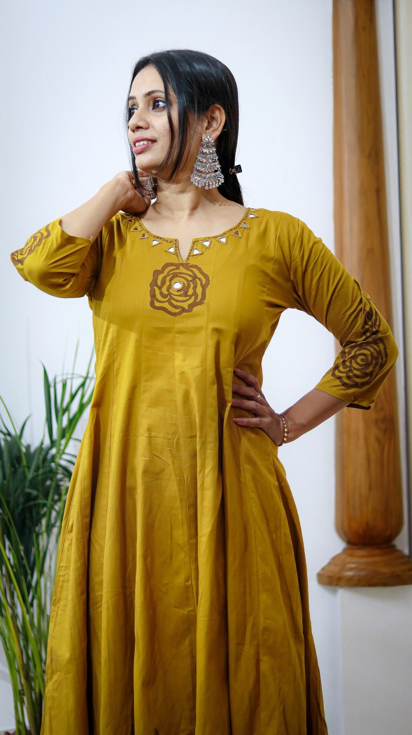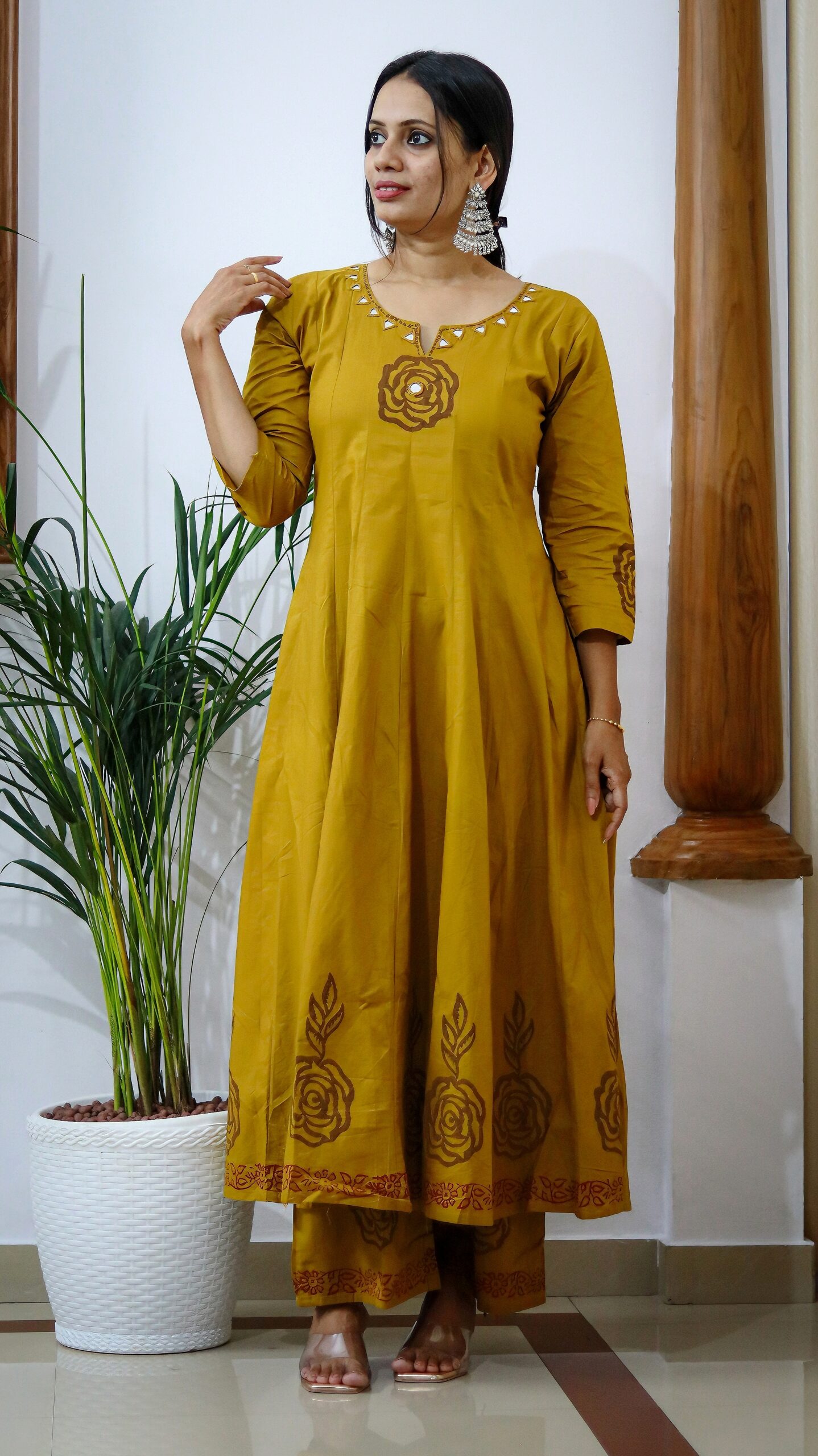 Radiate timeless grace in this Pure Cotton Anarkali Set, crafted with 8 flowing panels for a beautifully flared silhouette. The rich mustard yellow hue is elevated with subtle mirror work detailing that adds just the right touch of shimmer for festive or casual chic wear.